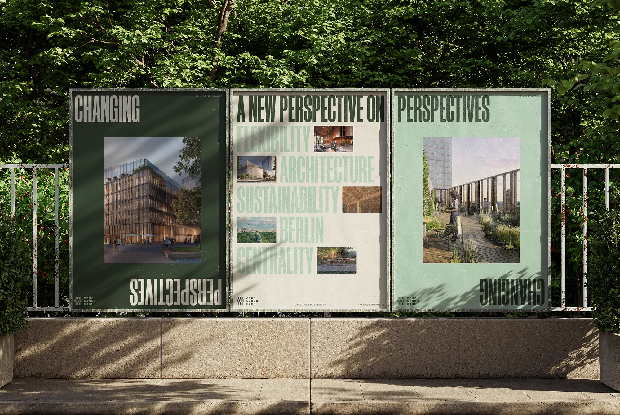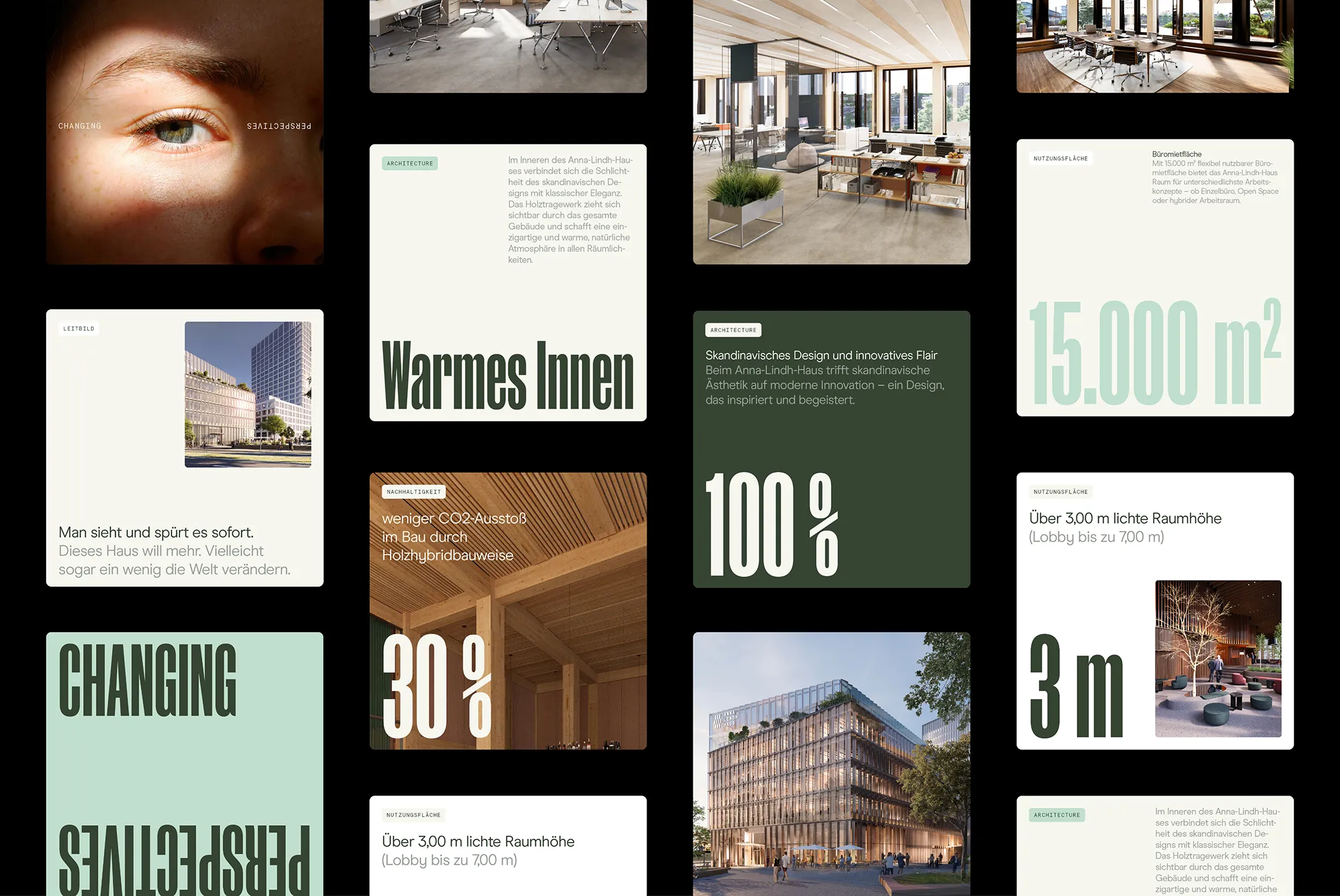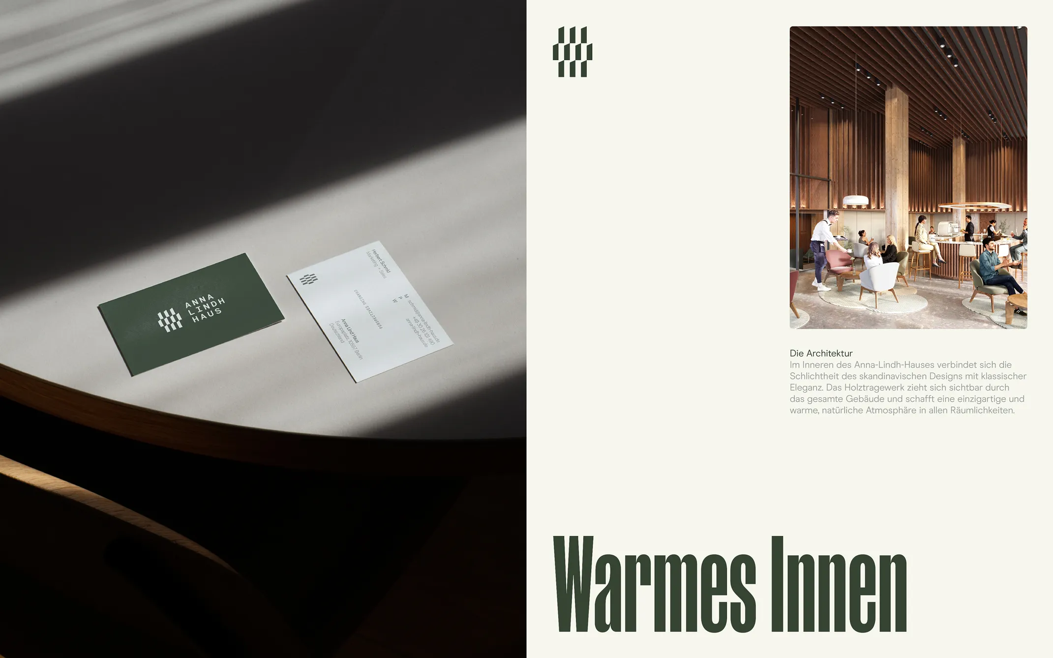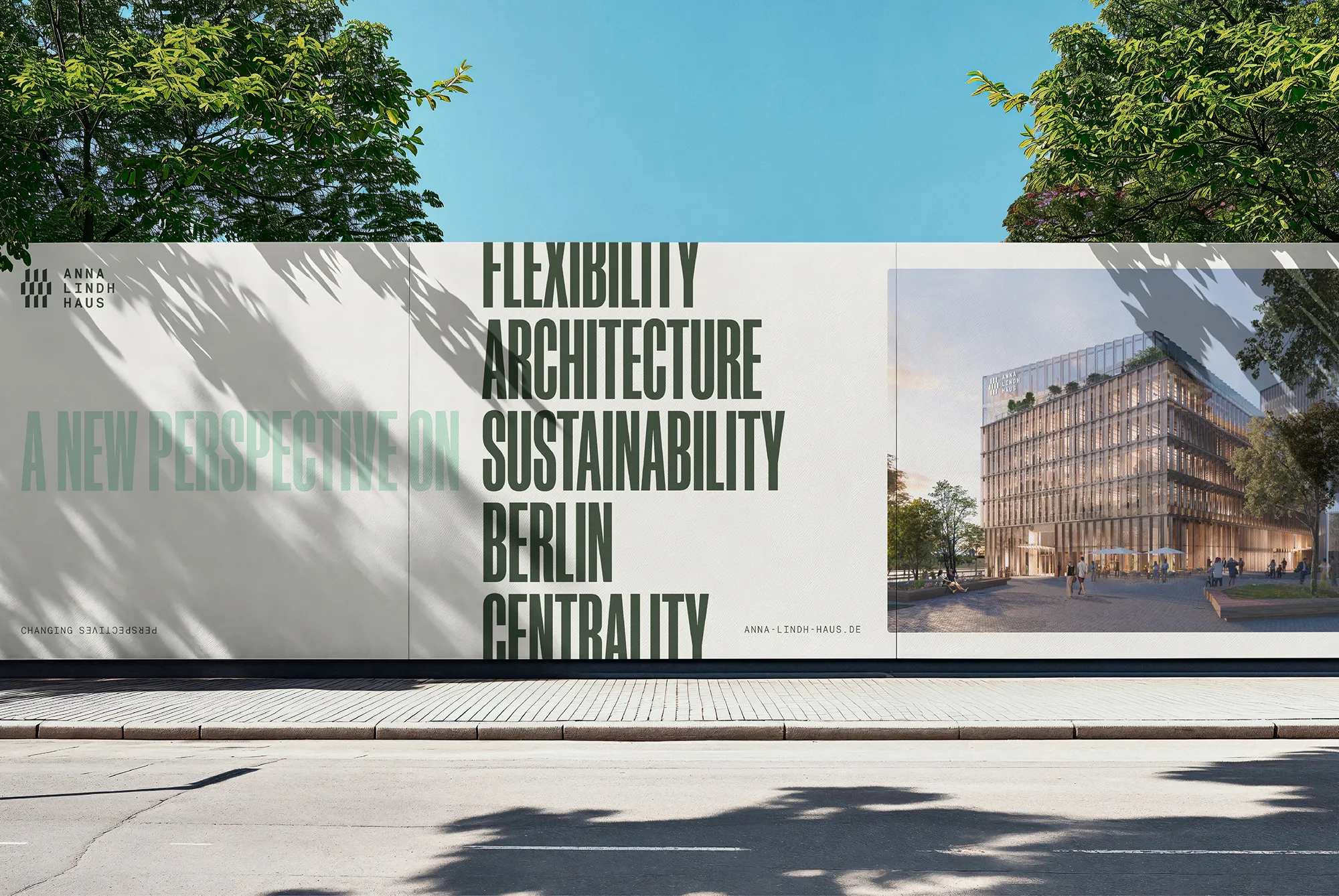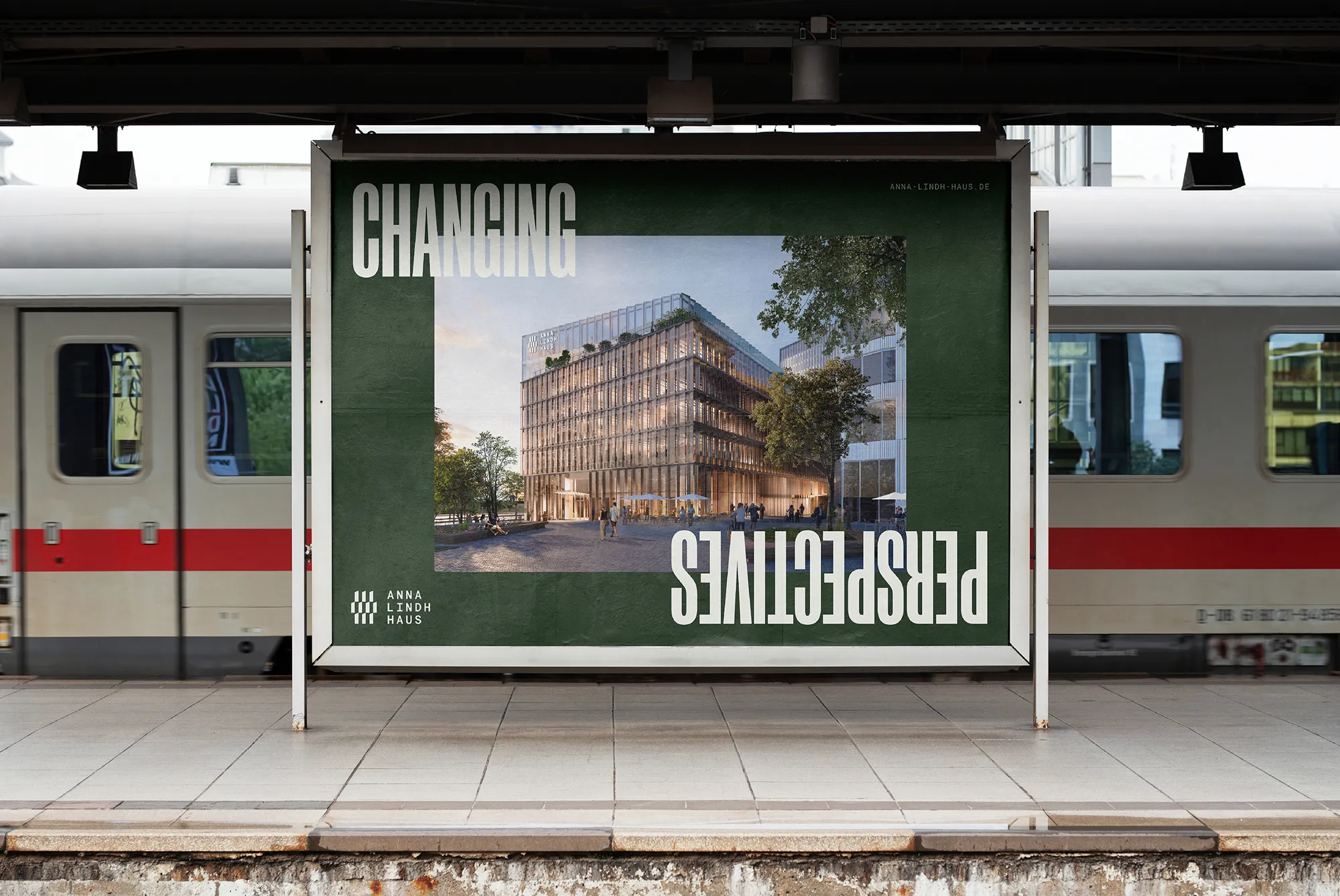 Das Markenzeichen des Anna Lindh Hauses ist inspiriert von der facettierten Glasfassade – ein flexibles, geometrisches Zeichen, das Klarheit und Perspektivwechsel zugleich ausdrückt. Die Farbwelt ist reduziert, das Design hochwertig und zurückhaltend. Der Claim Changing Perspective verbindet Architektur, Haltung und Standort: Das Gebäude eröffnet nicht nur einen neuen Blick auf die Stadt – sondern auch auf Themen wie Mobilität, Klimaschutz und urbane Zukunft.