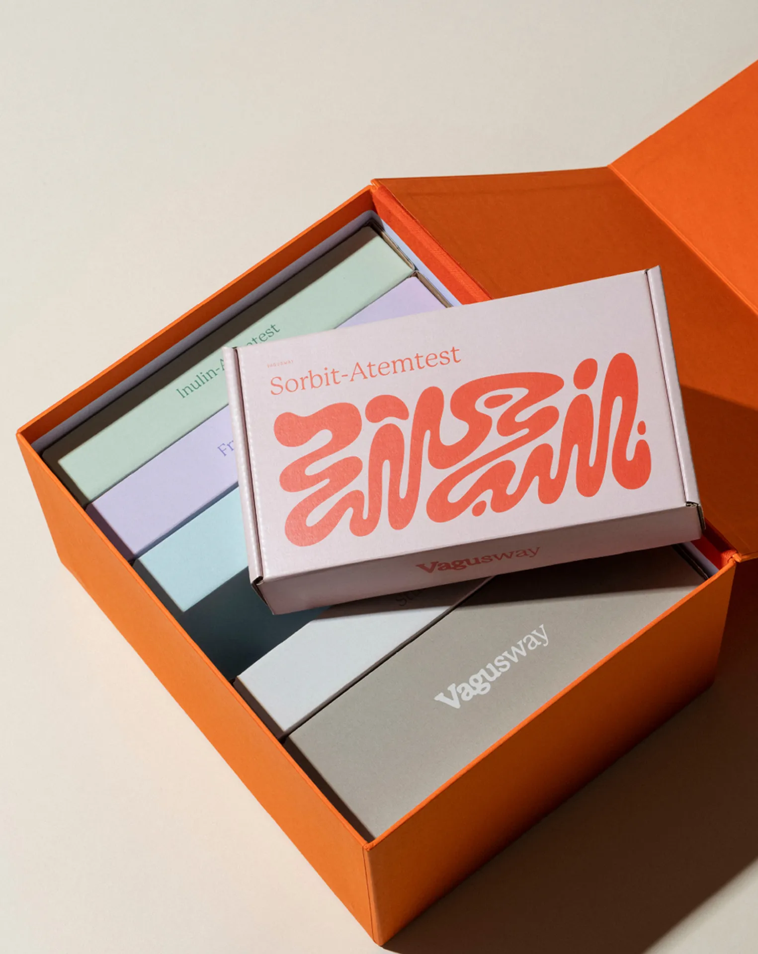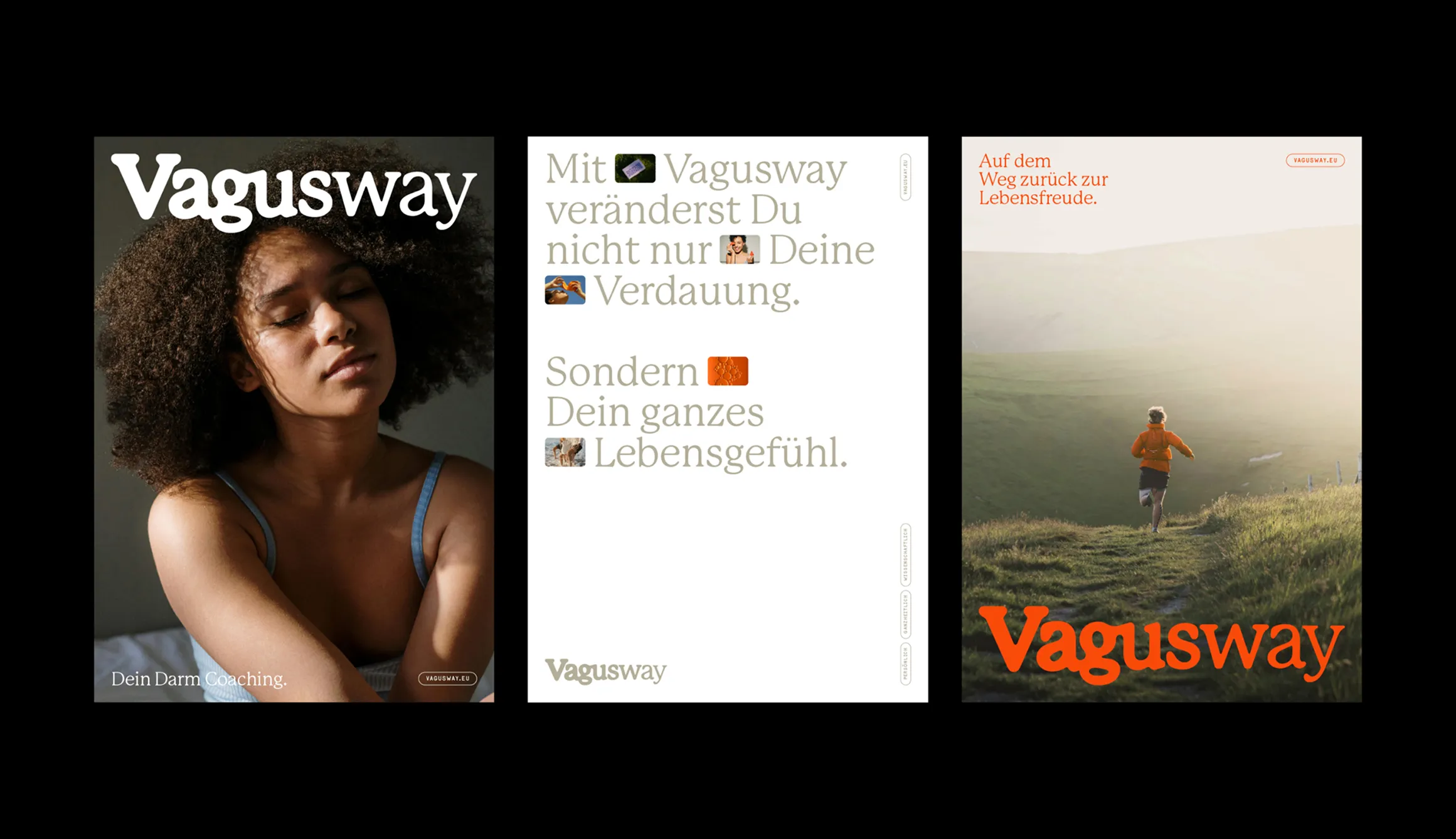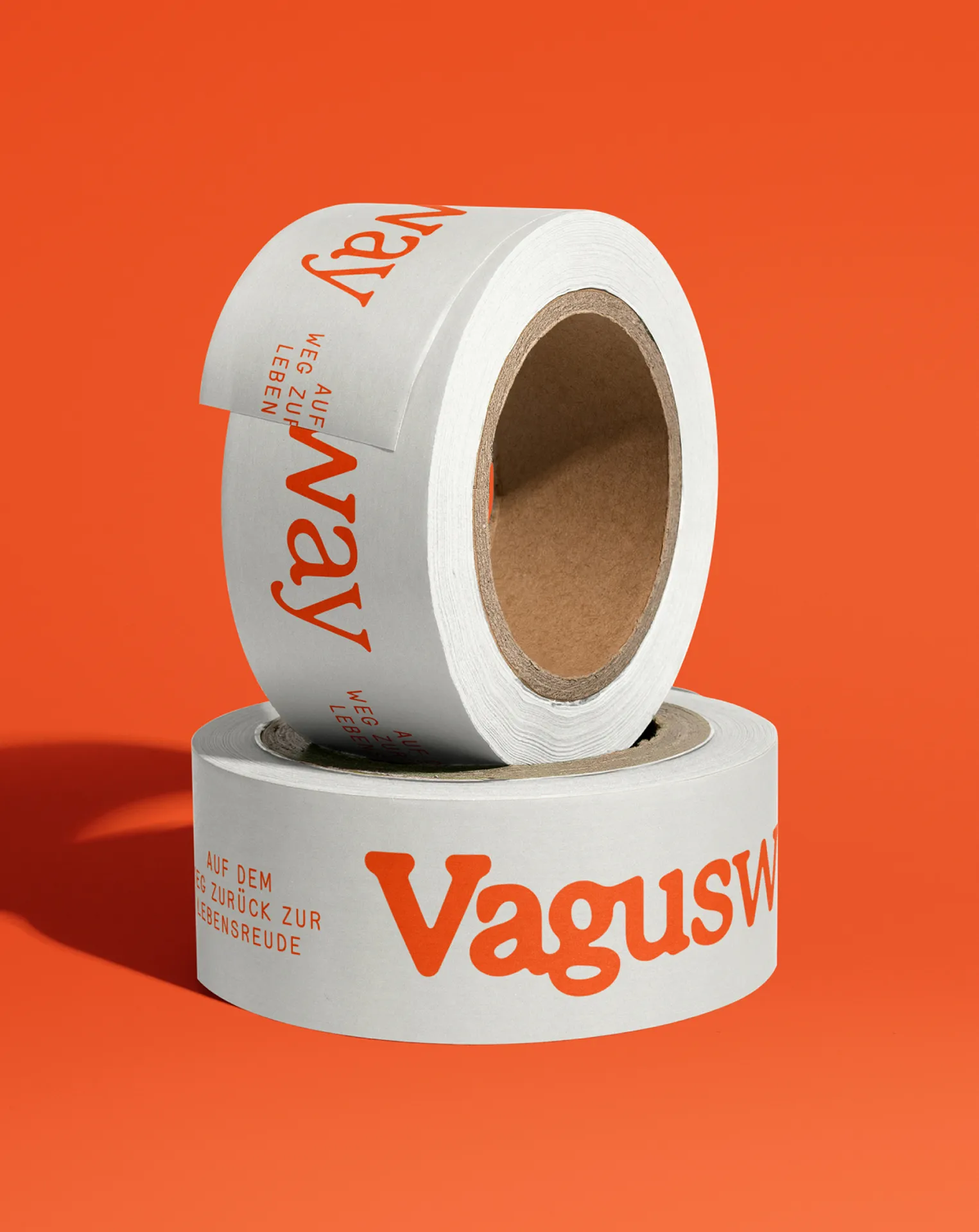 Das Erscheinungsbild verzichtet bewusst auf die klassische Bildsprache der Pharmawelt. Stattdessen vermittelt Vagusway emotionale Zuversicht, strukturelle Klarheit und einen lebensbejahenden Ton. Die App ist so gestaltet, dass Nutzer*innen sich intuitiv zurechtfinden und individuell begleitet fühlen. Die Verpackungen sind funktional und hochwertig, aber zugleich warm und vertrauensvoll gestaltet – eine Einladung zur aktiven Selbstfürsorge.