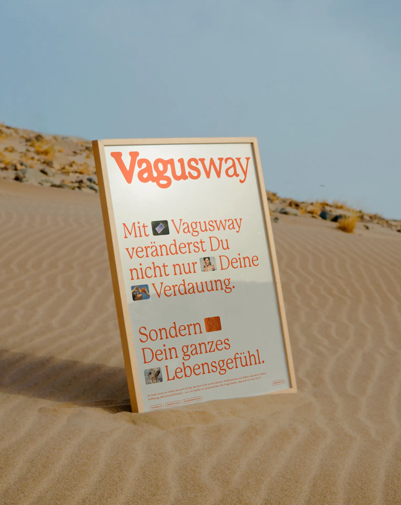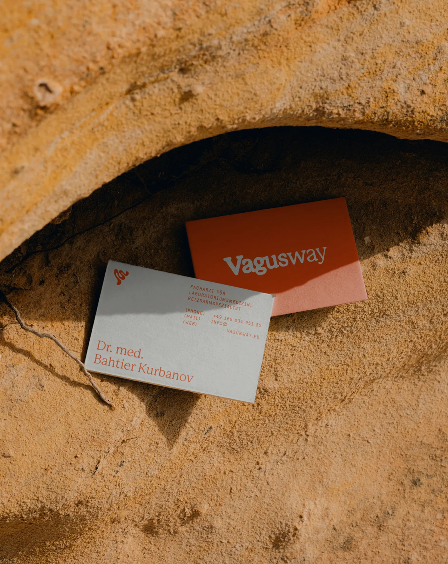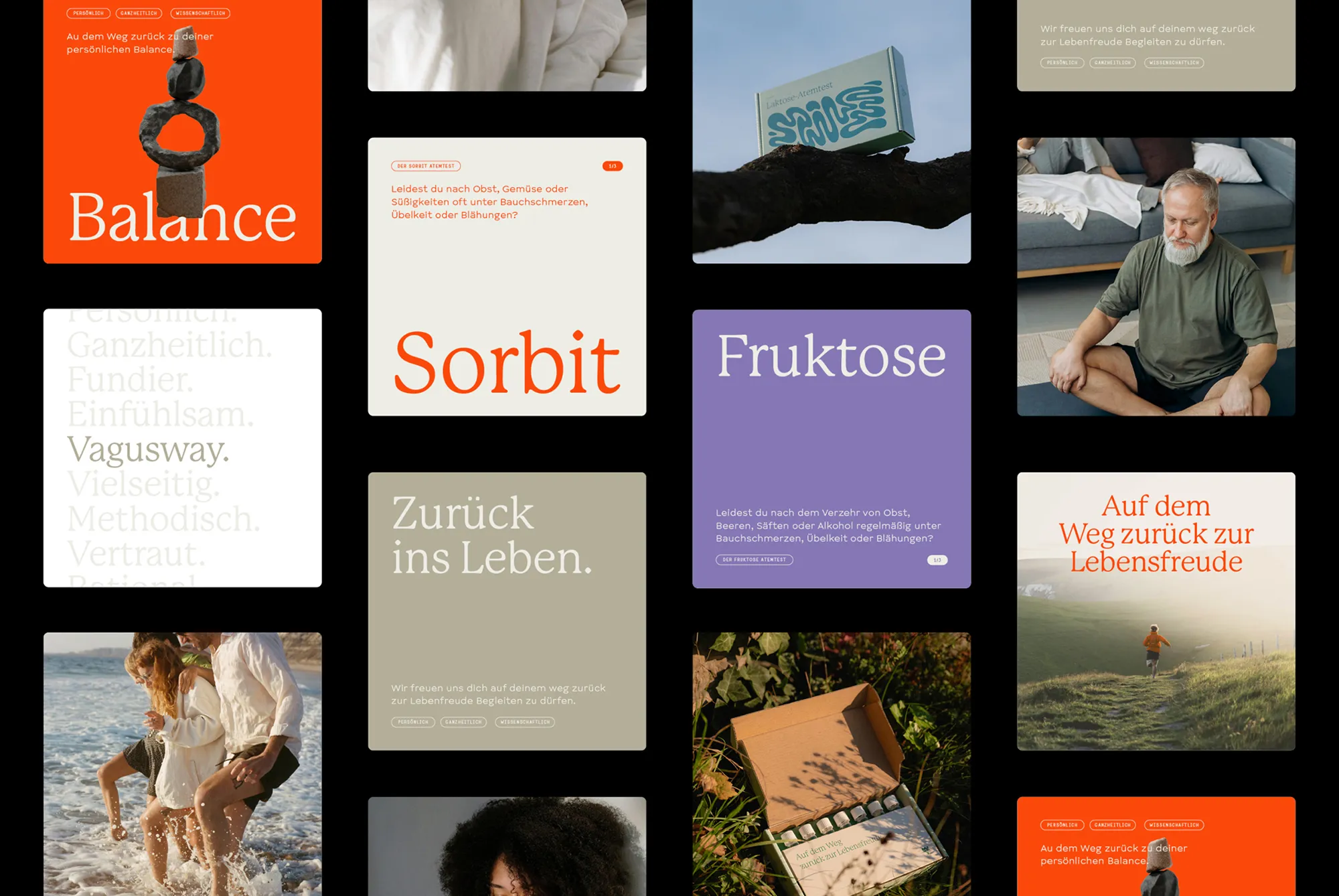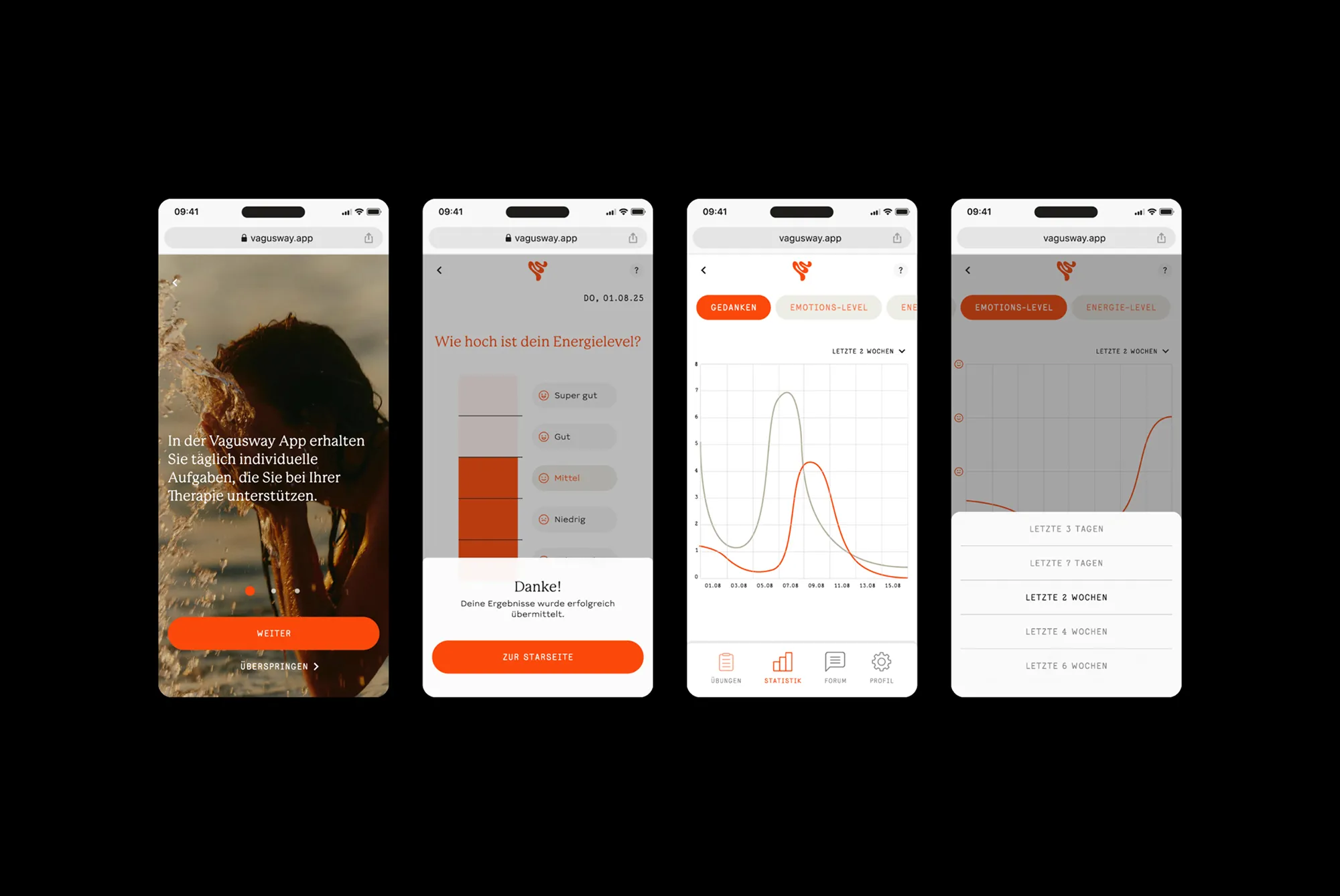 Das Erscheinungsbild verzichtet bewusst auf die klassische Bildsprache der Pharmawelt. Stattdessen vermittelt Vagusway emotionale Zuversicht, strukturelle Klarheit und einen lebensbejahenden Ton. Die App ist so gestaltet, dass Nutzer*innen sich intuitiv zurechtfinden und individuell begleitet fühlen. Die Verpackungen sind funktional und hochwertig, aber zugleich warm und vertrauensvoll gestaltet – eine Einladung zur aktiven Selbstfürsorge.